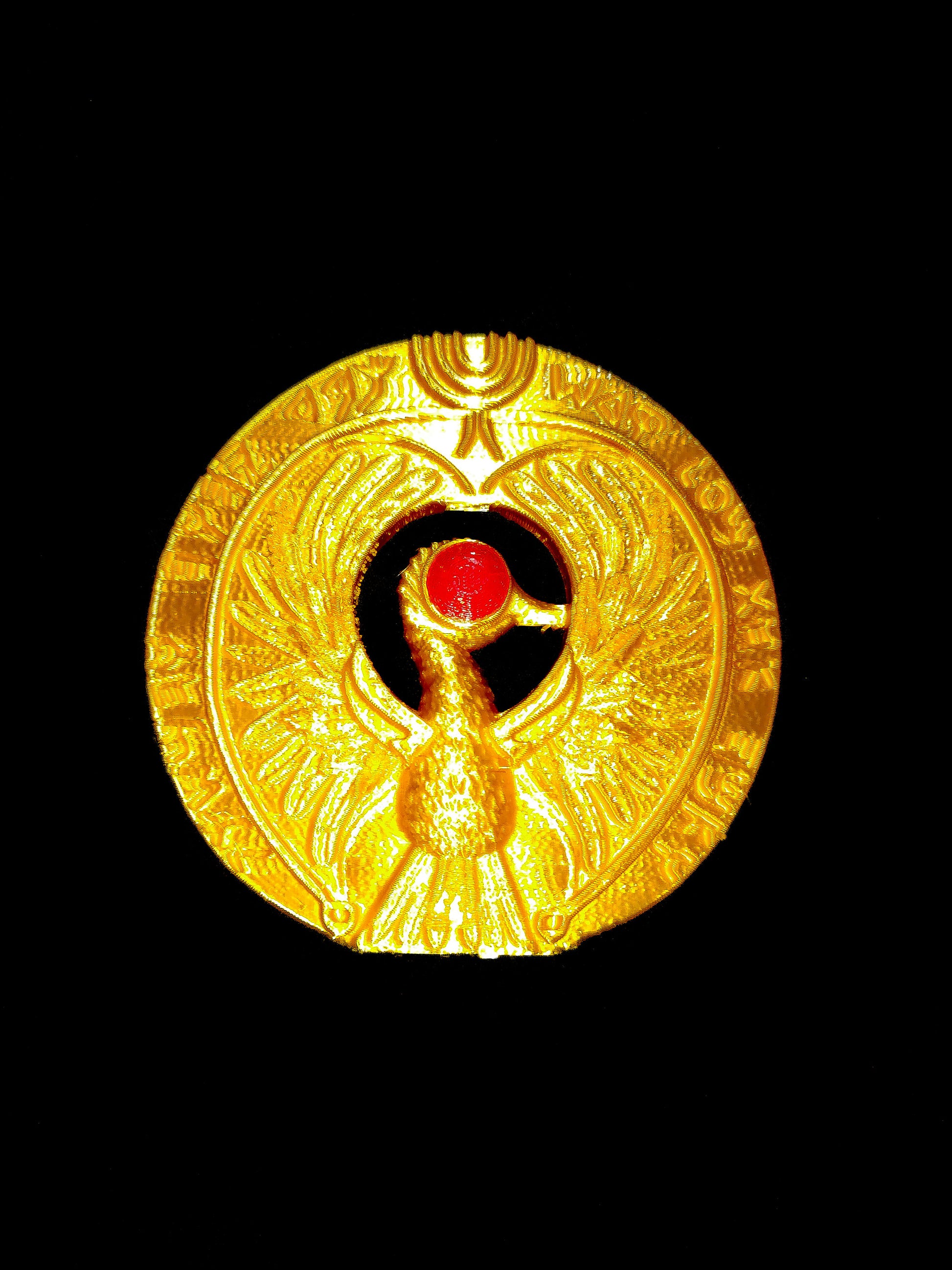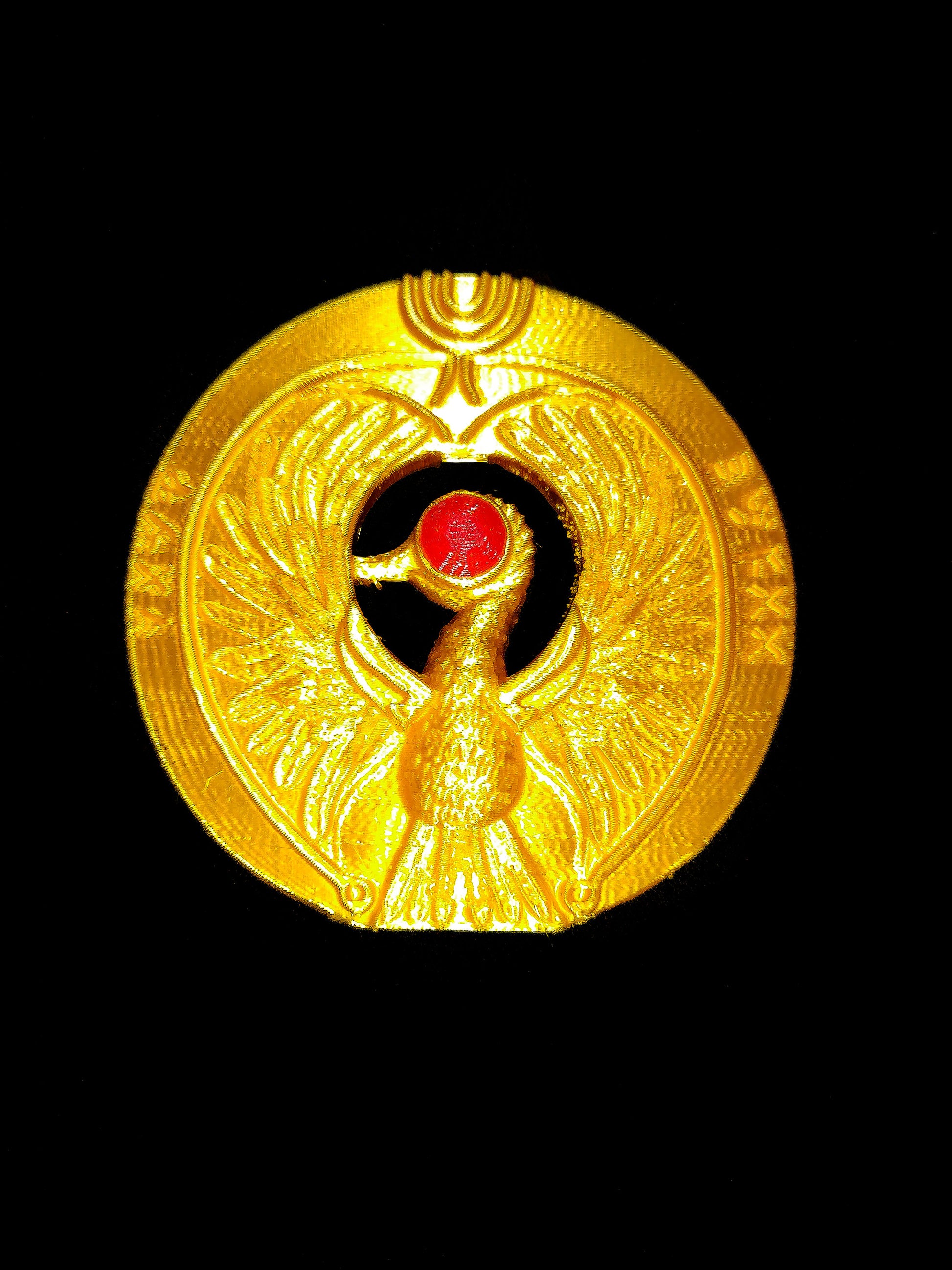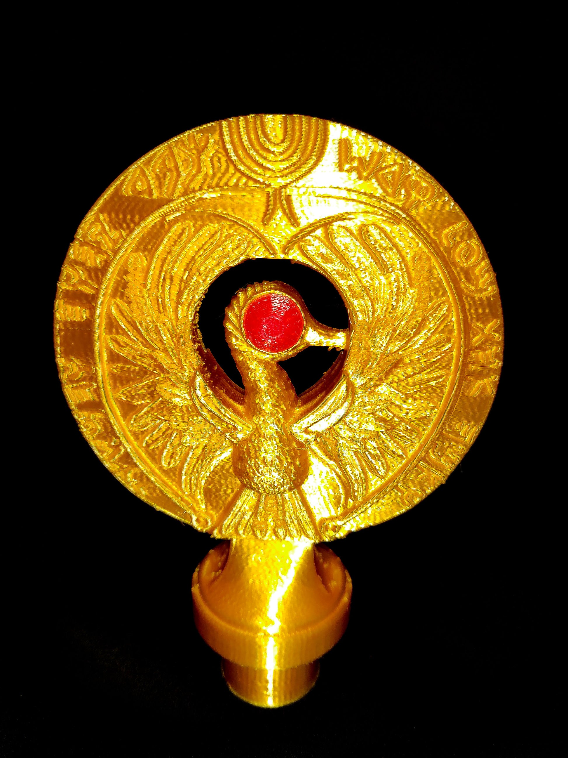 Item is 3D Printed using Gold PLA plastic and Red PLA for the eyes.